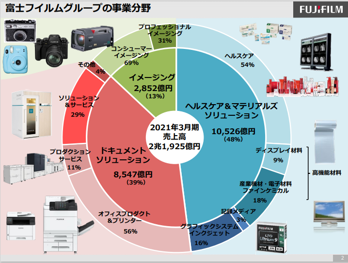 写真フイルム事業から始まり、今ではヘルスケア事業やプリンターなど各領域で一流製品を提供する、複合企業です。